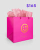 The $165 JRC Gift Bag by Jenna Rae Cakes features a bright pink bag with a yellow smiley face logo and is filled with pink patterned tissue paper. Jenna Rae Cakes appears on the bag, and purple $165 text is shown in the top right corner.